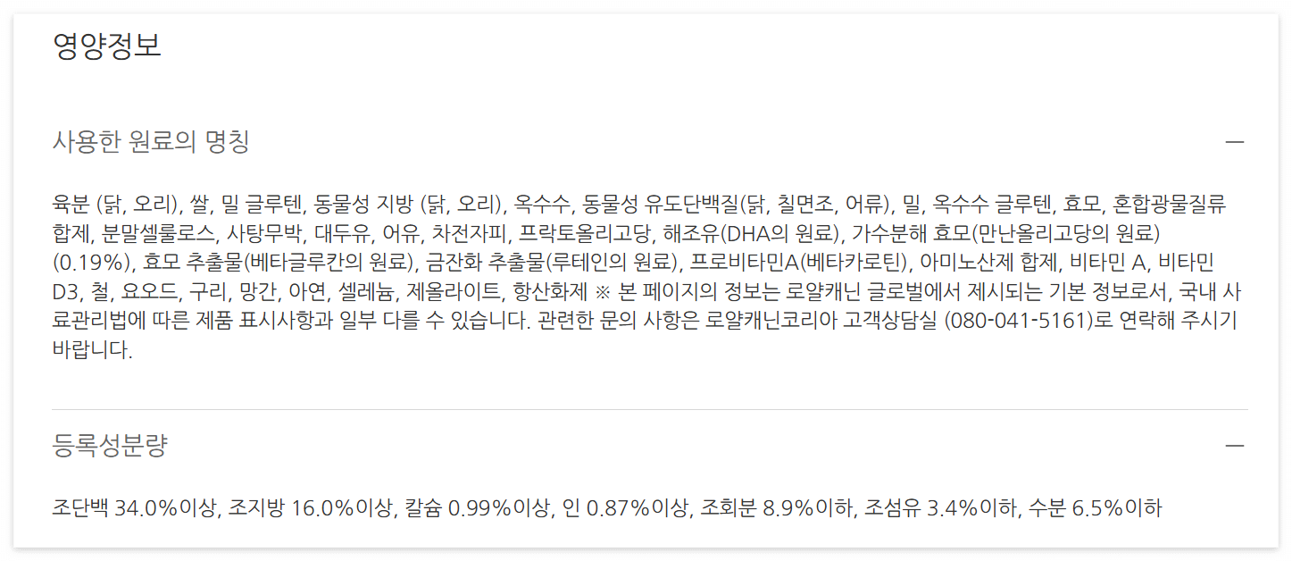 * 사료 분석에 관한 모든 내용은 작성 시점의 국내 공식 홈페이지 내용을 우선으로 하며, 세부 성분의 변경이 있을 수 있고 해외 판매 제품과 차이가 있을 수 있습니다.